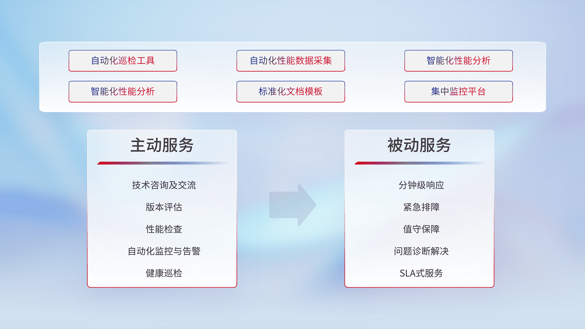 智能化工具和标准化文档,,,,保障服务质量,,,,提供主动服务(包含技术咨询、、、、版本评估、、性能检查、、、自动化监控与告警、、健康巡检)和被动服务包含(分钟级响应、、、、紧急排障、、、值守保障、、、问题诊断解决、、、SLA服务)。。