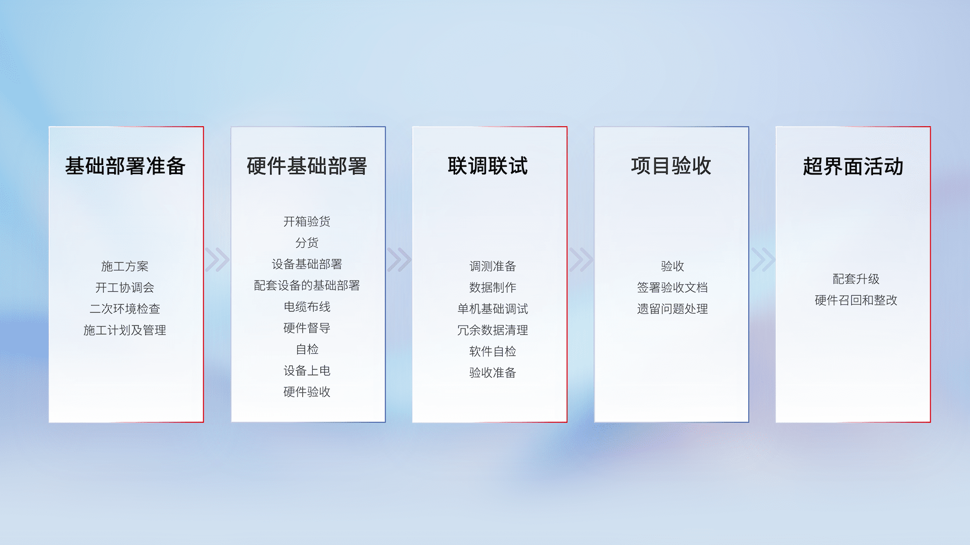 从基础部署准备、、硬件基础部署、、、联调联试、、、项目验收、、、、越界面活动的全过程可追溯,,,,保证施工质量和进度。。