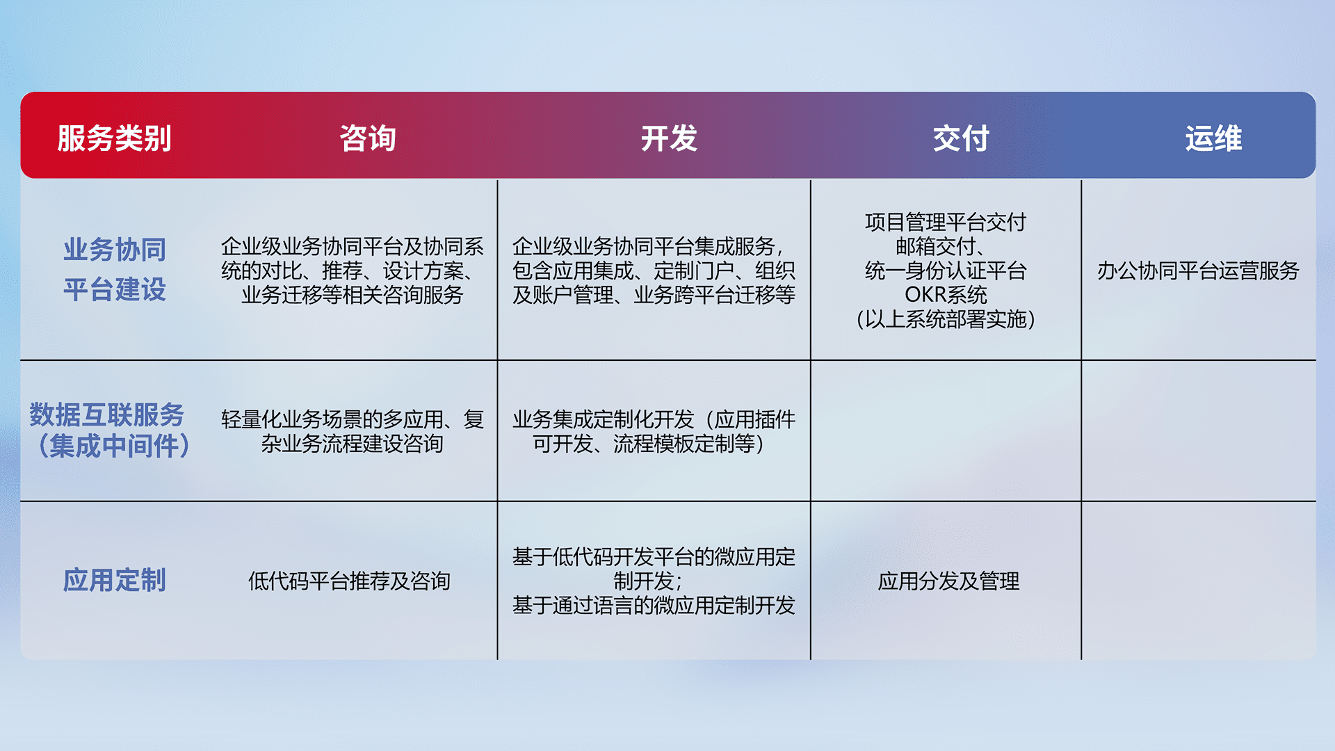 针对钉钉、、、企微、、IDaas等平台级产品提供产品的规划、、方案、、、交付、、、定制化开发等服务,,实现如统一协同办公、、智能客户服务、、、混合会议管理、、、智能数据查询、、、、等业务场景,,,,实现数字化转型。。